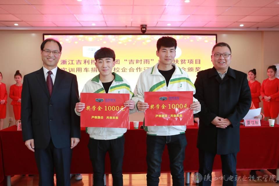 新年伊始,陕西机电职业技术学院2018年1月10日在汽车机电大楼4楼会议室隆重举行“浙江吉利控股集团‘吉时雨’精准扶贫项目实训用车捐赠暨2017年度校企合作订单班奖学金颁发仪式”。