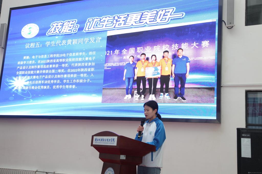 铁道工程学院教师代表张新蕾、电子与信息工程学院学生代表黄颖分别发言。现场共同欣赏了新时代我校学子“红心向党 技能强国”青春宣言短片和经管与艺术学院带来的教学技能展示。