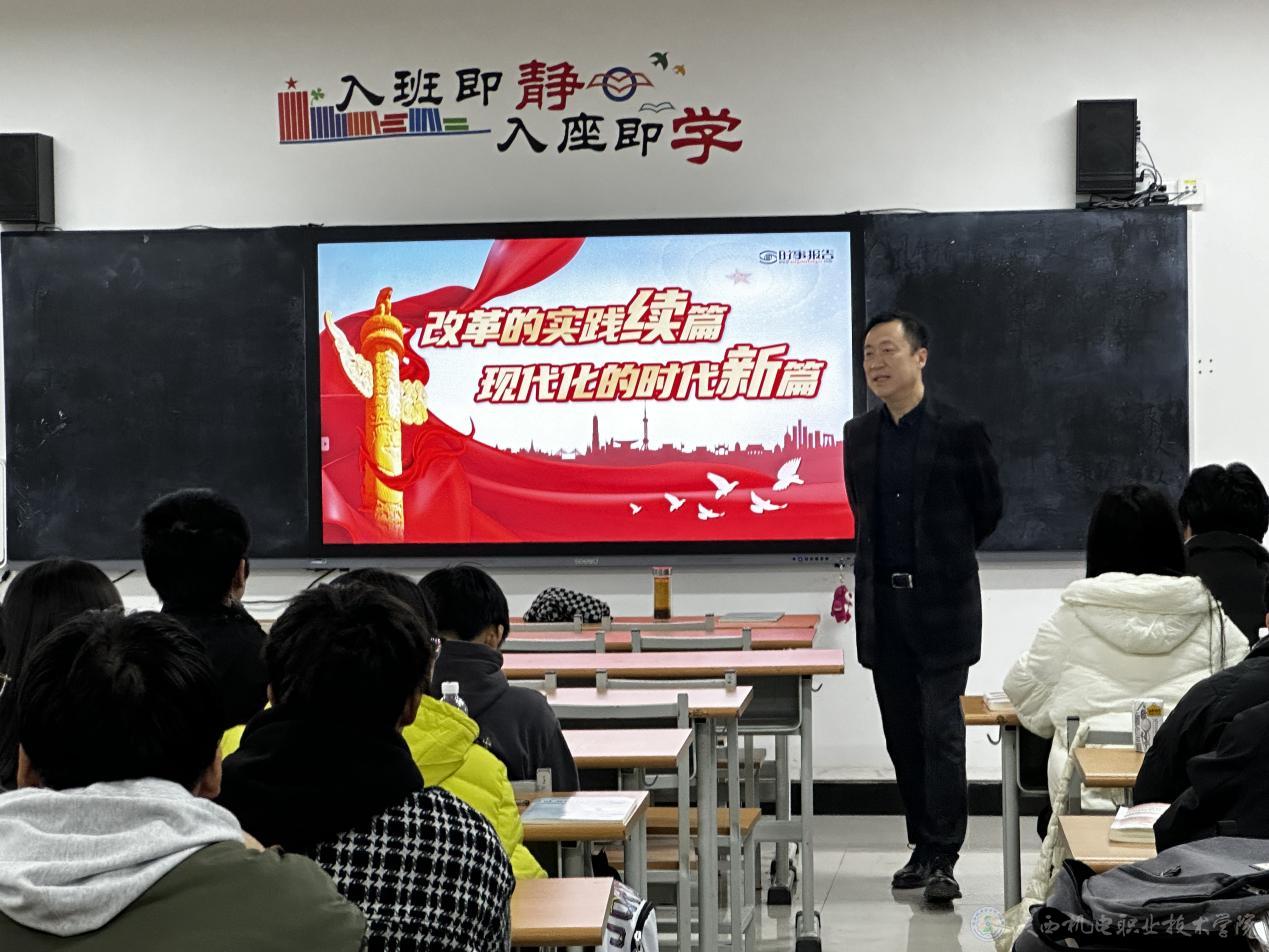 11月22日上午,陕西机电职业技术学院党委委员、副院长张克在博学楼316教室为23机电技术1、2合班学生上形势与政策课,讲授《改革的实践续篇 现代化的时代新篇》专题内容。