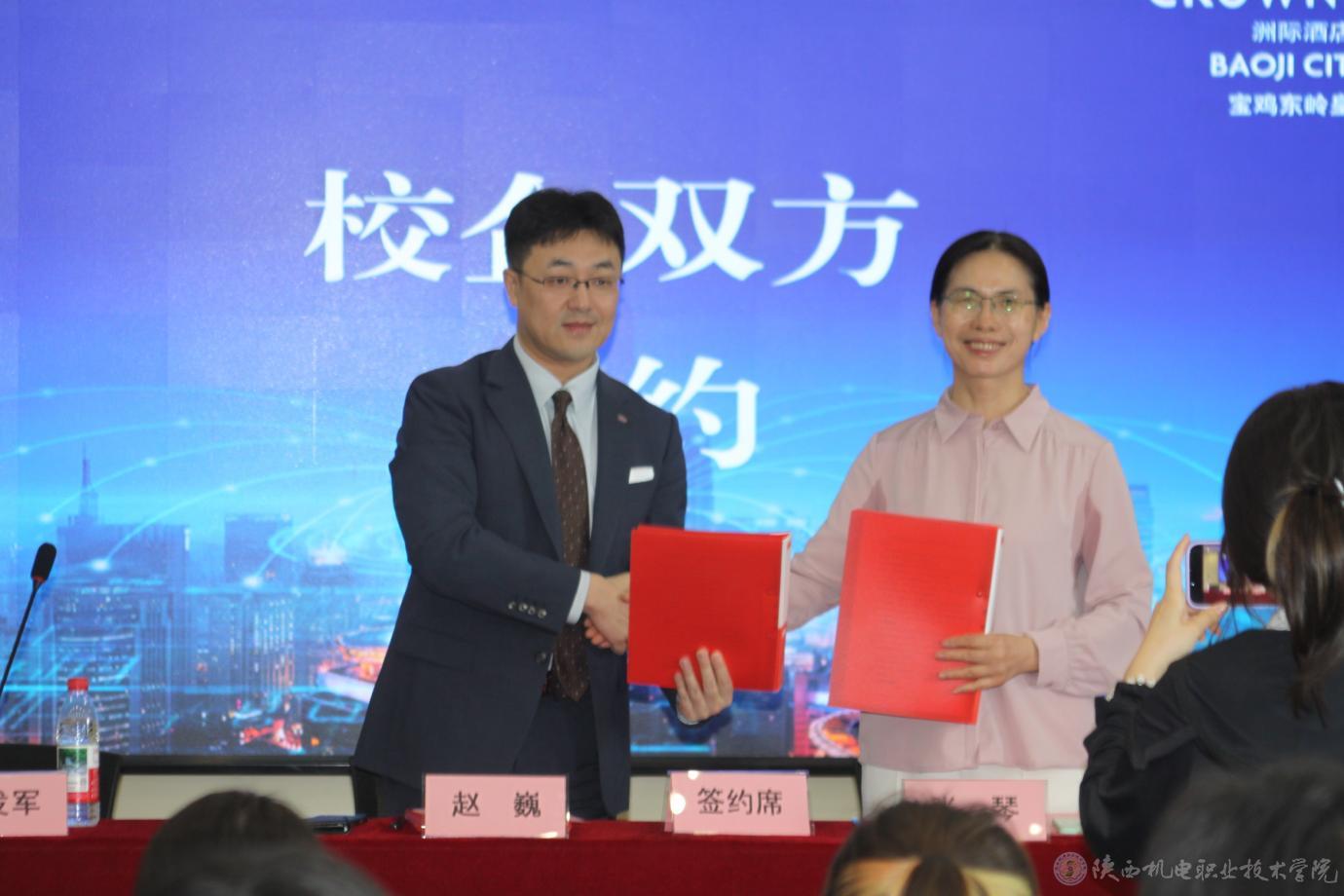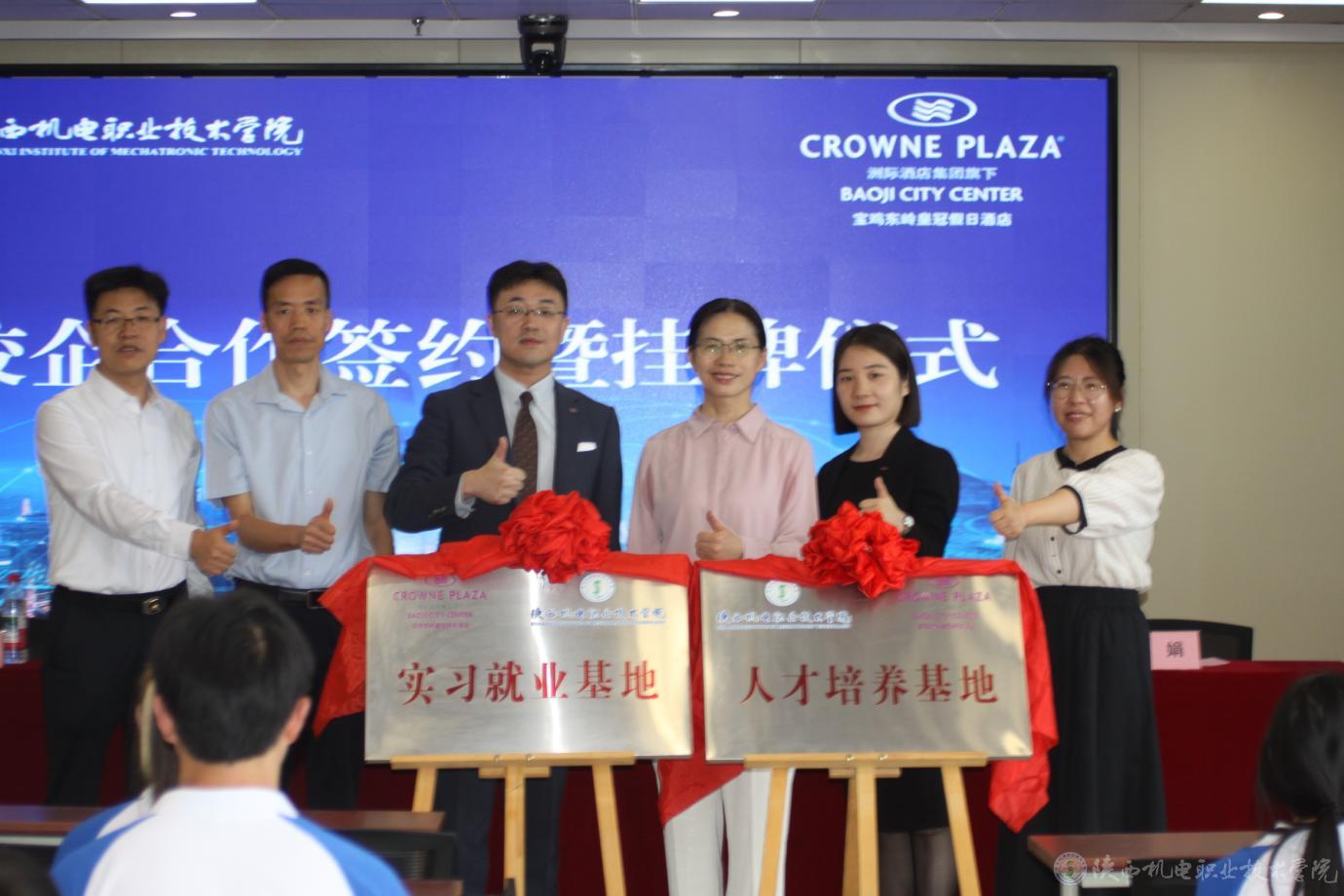 接着,张琴和赵巍为陕西机电职业技术学院在宝鸡东岭皇冠假日酒店的“就业实习基地”和宝鸡东岭皇冠假日酒店在陕西机电职业技术学院的“人才培养基地”揭牌,并进行校企合作签约仪式。