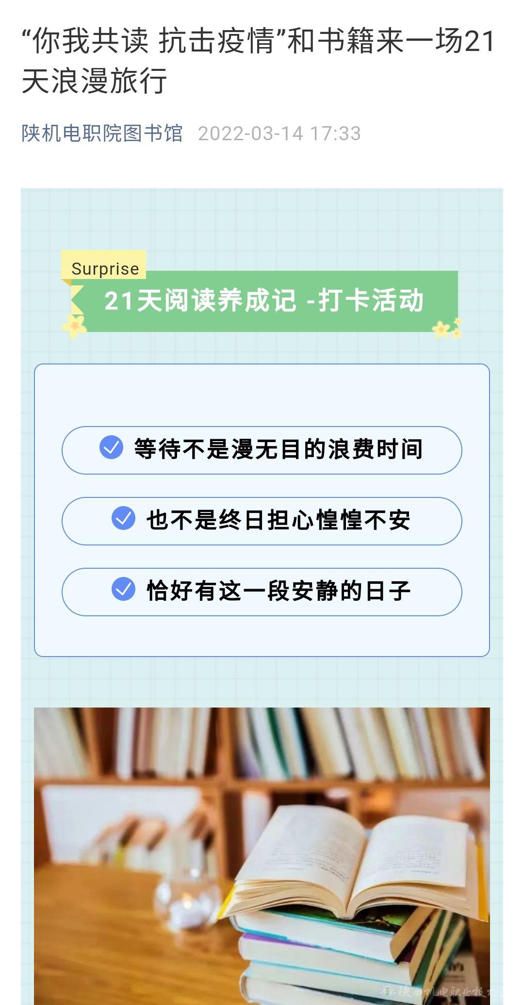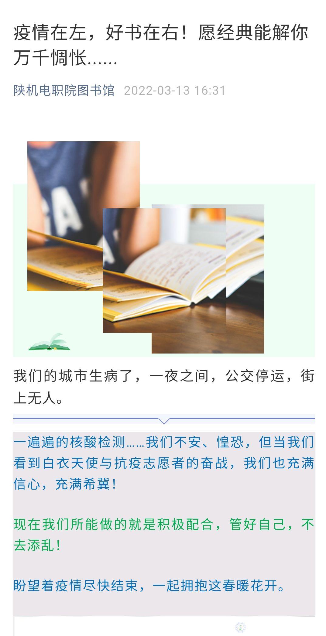 2、为丰富师生疫情防控期间的精神文化生活,坚定战胜疫情的信心,图书馆及时调整服务方案,从线下转线上,从纸质变电子,充分利用网络平台和微信公众号,QQ群等加强线上服务及阅读推广,发布了“疫情在左,好书在右!愿经典能解你万千惆怅”和组织开展“你我共读,抗击疫情”21天阅读打卡活动。